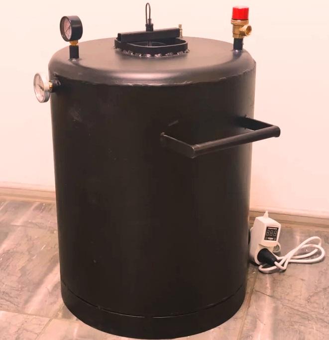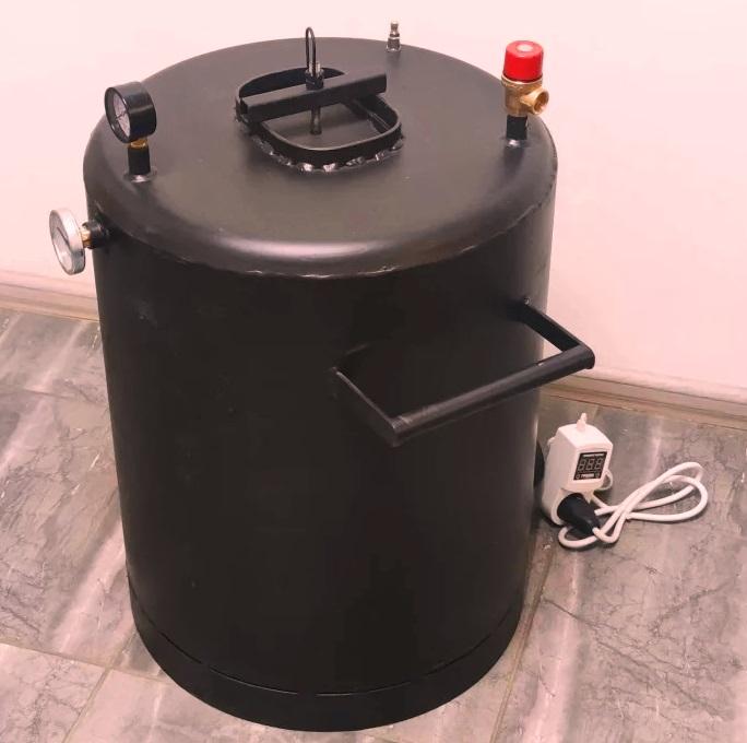 The autoclave is made of black steel 3 mm thick (the lid is 4 mm). The heater of the Italian company THERMOWATT and the domestic thermostat Troyan are responsible for heating. All that is required is to set the required operating mode on the thermostat according to the recipe, and the device will automatically start and stop heating at the right time.