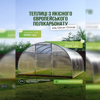 Oscar Group has been working with polycarbonate and transparent structures since 2007. We make greenhouses not just as a frame with a coating, but as a reliable long-term crop protection for the Ukrainian climate: strong galvanized frame, well-thought-out nodes, high-quality coating.