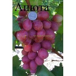 "Anyuta" grapes are table hybrid form of medium-late ripening grapes, 140 days. The bushes are strong. The flower is bisexual. Pollinates well. The bunches are beautiful, very large, weighing 700-1200g, conical, medium-dense. With good care, the mass of bunches can be more. Berries are very large, 35x24mm in size, 10-15g in weight, (sometimes larger) oval, rich dark pink color. The taste is pleasant with a light nutmeg. The pulp is dense, fleshy and juicy. The skin is dense, but edible. There are 4 small stones in the berries. After rain, the berries can sometimes burst. For some time, remaining on the bush, they do not lose their marketable qualities. But you should not overdo it for a very long time, as the pulp can become liquid. The hybrid form of Anyuta is not susceptible to pollination. Sugar accumulation is good. The hybrid form of Anyuta is clearly a market variety due to the excellent taste of the berries and the remarkable appearance. Large clusters and the beautiful color of large berries attract the attention of buyers. It is almost not affected by wasps, and only very rarely can it crack