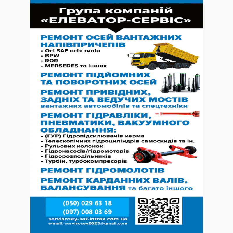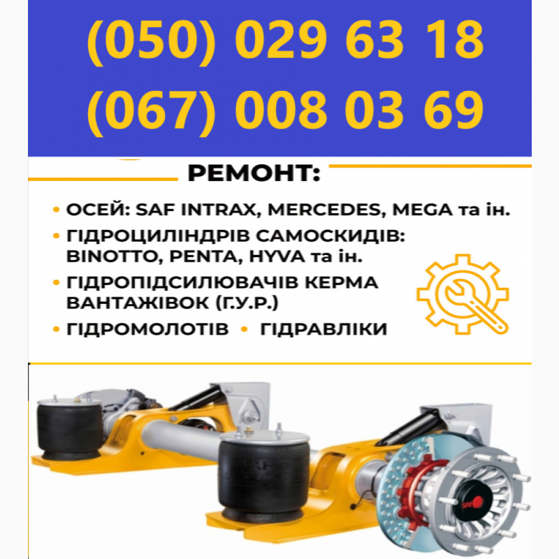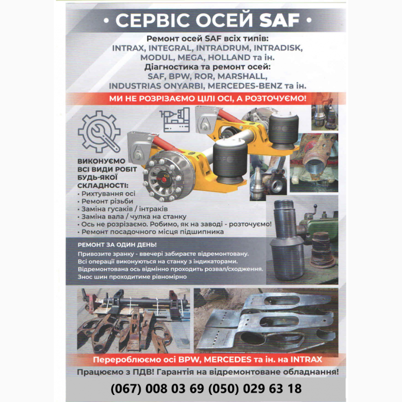 Repair and restoration of SAF axles of MERCEDES and other manufacturers Repair and restoration of axles of MERCEDES and other manufacturers. Repair of SAF axles of all types Intrax Integral, Bpw, Ror, Marshall, Undustrial, Intradrum, Intradisk, Onyarb, Modul, Mega, Holland, Frh, Trl and others. We repair trailers andsemi-trailers Schmitz, Cargobull, Krone, Kogel, Schwarzmuller, Trailor, Kassbohrer, Lohr, Rolfo and others, as well as timber trucks, cement trucks,tanker trucks, refrigerators, car transporters, dump trucks, grain trucks, container trucks, cattle trucks and others. ready to provide you with the best solutions.