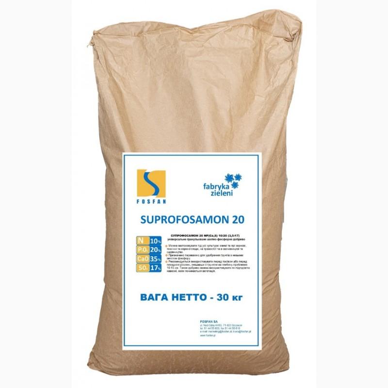 Супрофосамон NP (CaS) 10-20(3, 5-17) - концентроване гранульоване добриво, що містить азоту 10% в амонійній і амідній формі, фосфору 20% розчинного у воді і мінеральних кислотах і сірку 17% в формі SO3 (сірка міститься в рухливій формі протягом всього вегетаційного періоду) та 3,5% кальцію, котрий приймає участь у розкисленні грунту.