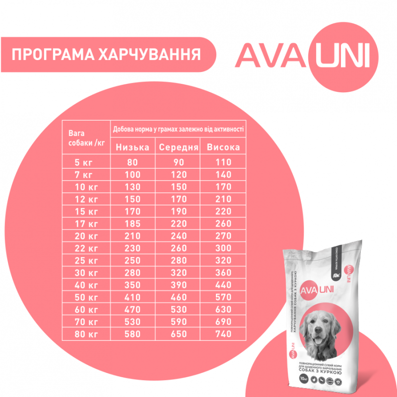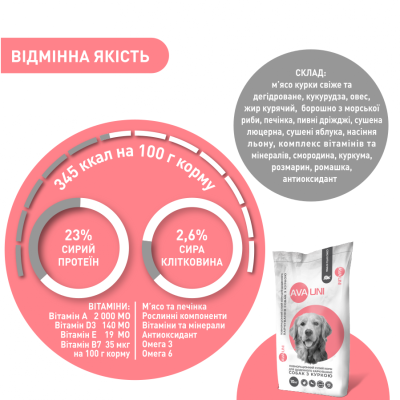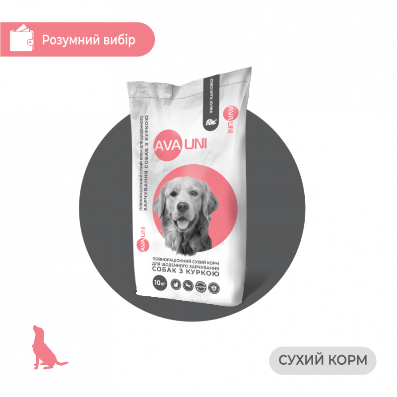 AVA UNI daily ready-to-eat food with juicy chicken contains high-quality feed ingredients and the content of necessary nutrients, which are selected in accordance with European dog nutrition standards. It will provide the dog's body with everything it needs and make the daily diet complete and balanced.
